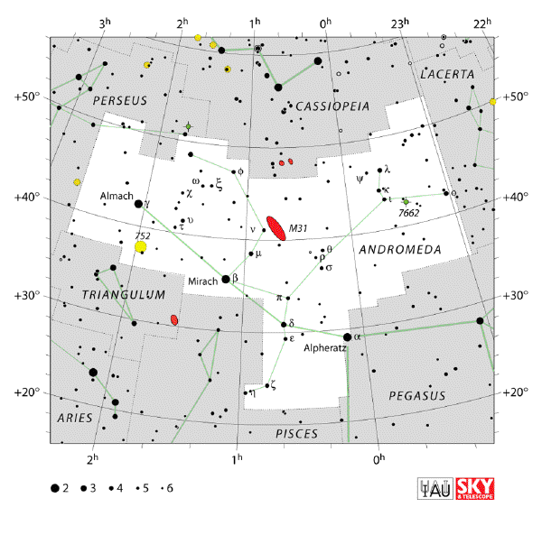 The bright star Alpheratz is part of the Great Square of Pegasus. The three brightest stars (Alpheratz, Mirach, and Almach) extend to the East from Pegasus over to Perseus. The Andromeda Galaxy (M 31) can be easily located following from red-giant Mirach through the fainter Mu (μ) Andromedae to a fuzzy patch that is the galaxy. Scanning with binoculars slightly “left” from between Mirach and Almach, you might spy the open cluster NGC 752. Similarly, going from Mirach in the opposite direction from M 31 you might see the large - but faint - Triangulum Galaxy (M33).