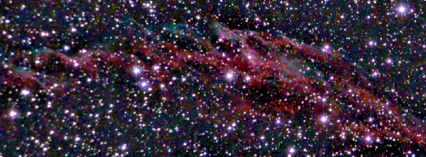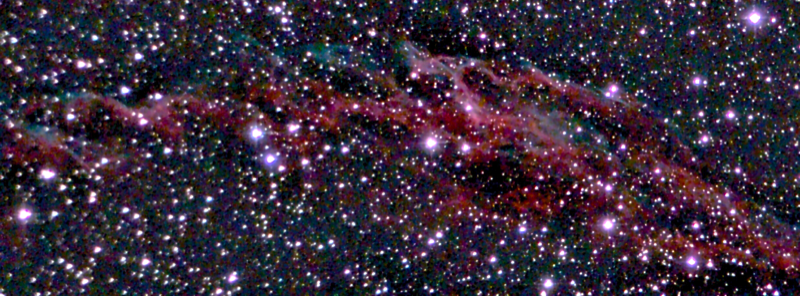 Thanks to some prodding I turned my small imaging scope to parts of the Veil Nebula the night of 9/14. While it was always on my to-do list, I was discouraged by itβs faint surface brightness (18 mag/arcmin2 ). This is a crudely post-processed image of a 25m exposure of the Eastern part of the nebula (NGC 6992) in Cygnus. I still have a lot to learn, but being able to see some of the subtle blues amongst the reds in its characteristic wispy stricture is really exciting! β Bob D.