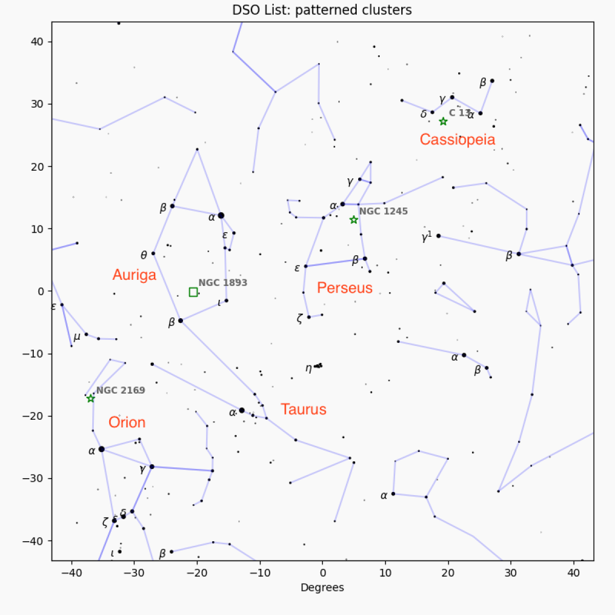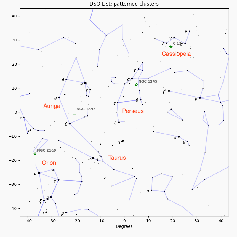 Hereβs a finding chart for all four of these clusters. Scanning the Milky Way from Cassiopeia down to Orion will show even more clusters!