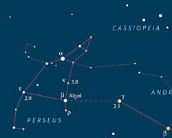Astronomically, the constellation is almost overhead in the late Fall, lying in the plane of the Milky Way. Therefore, it’s rich in deep-sky objects associated with the Galaxy: open star clusters and nebulae, plus a few extra-galactic objects (though mostly very faint, requiring telescopes of moderate aperture to enjoy them. One very large cluster, centered around α Persei (Mirfak) is a young (50-70 Myr old); Mirfak is the brightest star - a yellow supergiant; several other bright members (incl. δ, ε, and ψ Persei) are all hot, blue, B-type stars, all over 10 times the mass of the Sun, and with lifetimes of only a few million years. Another special star, β Persei is “Algol” the Demon star, representing the eye of Medusa, is one of the first variable stars recorded, officially in 1667, though anecdotally it may have been noticed before then.
