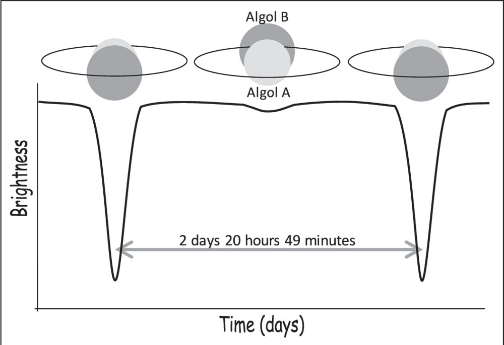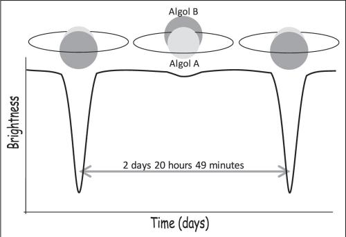 Finally, a variable star. Algol is an eclipsing binary star, with a hot blue star eclipsed by a cooler K sub giant every 2.867 days. Because the orbit is in our line of sight, this causes a dip in brightness from magnitude 2.1 to 3.4, with the (partial) eclipses lasting 10 hours. You can track this visually by comparing Algol to Gamma Andromedae (also mag 2.1), Epsilon Per (2.9) and Kappa Per (3.8).