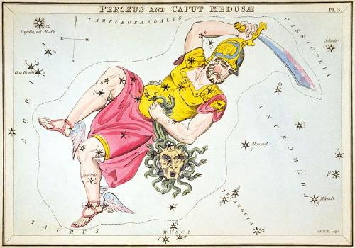 Perseus comes from Greek mythology, part of the story of Andromeda, where he rescues the maiden from being sacrificed to Cetus the sea monster, returning from slaying Medusa. In the sky he’s depicted wielding his sword and holding the head of the Gorgon. In Babylonia he’s the constellation of the “Old Man”.