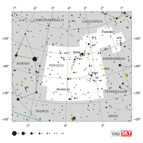 Perseus’ stars form two long trails of moderately bright stars, traced outward from Mirfak: the “head” points to the W of Cassiopeia, and down towards the Pleiades to the south; the second line of stars including Algol towards Triangulum and Aries. The Milky Way is present, although fainter and more diffuse because we’re looking mostly away from the center of the Galaxy (in Sagittarius); the anti-center is in nearby Auriga.