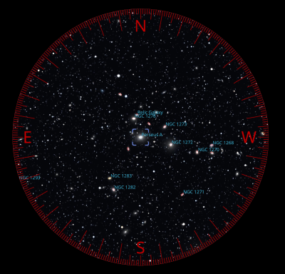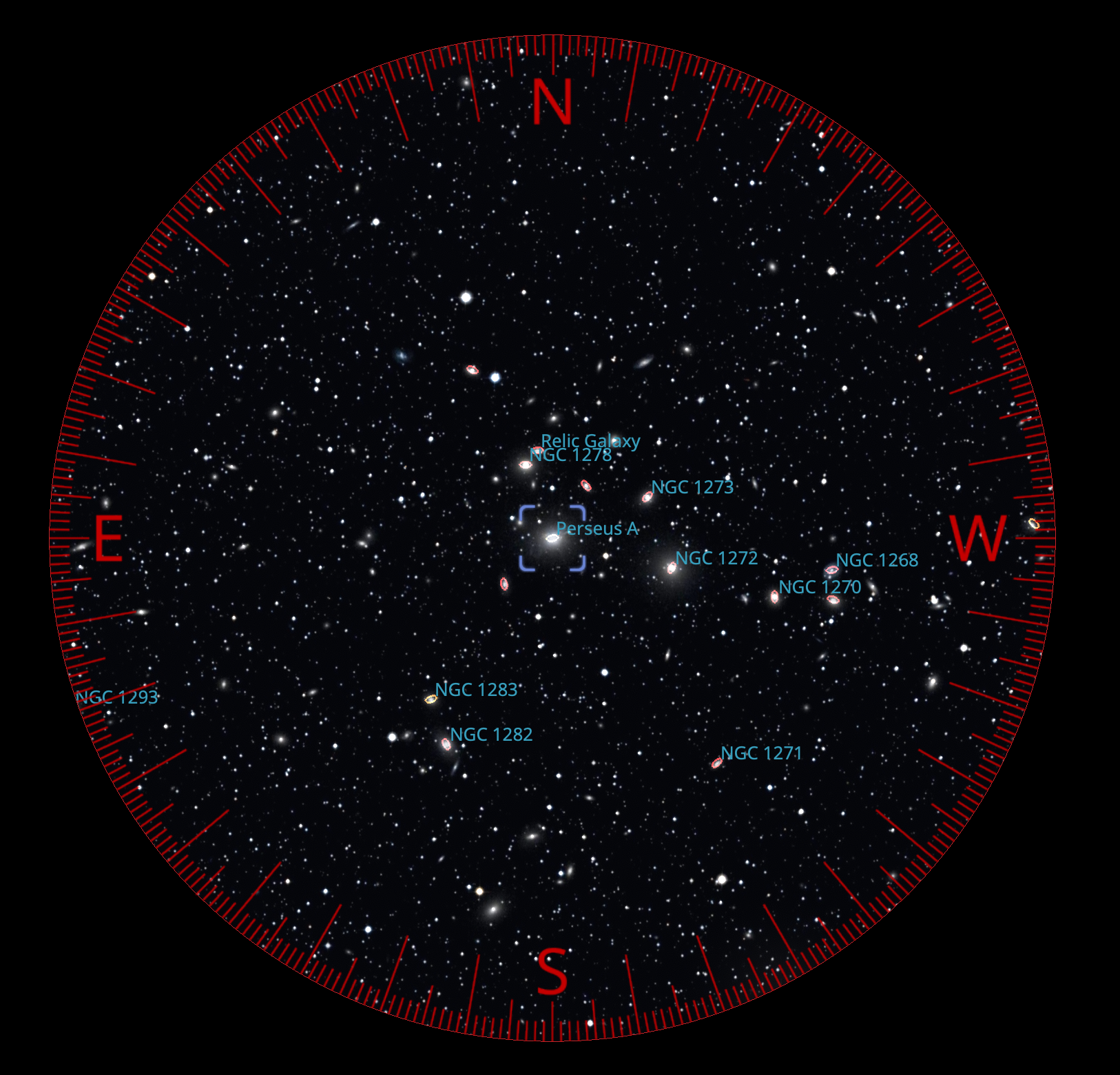 Just 2° NE of Algol, is Caldwell 24/NGC 1275 = “Perseus A”, a huge galaxy at the center of an entire cluster of galaxies, probably formed from cannibalizing the surrounding members of the cluster. While they’re generally not interesting to look at, what’s interesting here is that in a smallish field-of-view (1/2°) you can see well over a dozen cluster member galaxies around 13th-14th magnitude with a moderate-sized telescope. The image shows a simulated field with a 5” telescope and 17mm eyepiece.