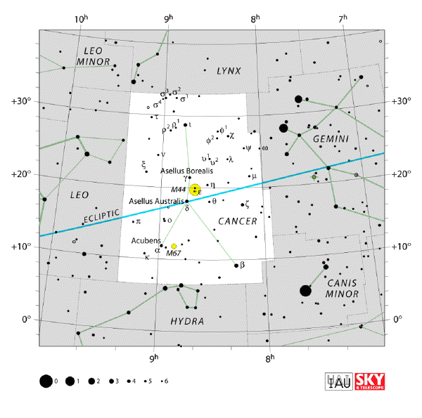 For observing opportunities, there are two prominent open clusters: Praesepe (the Beehive; Messier 44) and the “Golden-Eye” (Messier 67).