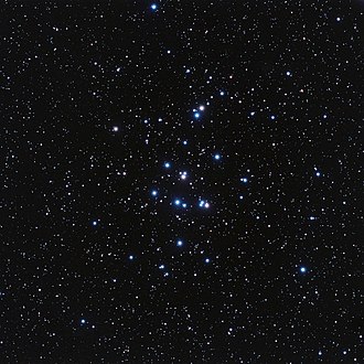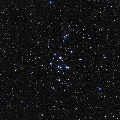 One of the closest clusters to the Sun (~600 ly), the Latin name means “manger”. Galileo observed it as early as 1609, seeing about 40 stars and was even mentioned by Hipparcos, c. 130 BC. It can be seen with the naked eye under dark skies, and easily found with binoculars or a small telescope. It has about 1000 stars, about 600 Myr old all within ~25 ly of each other.