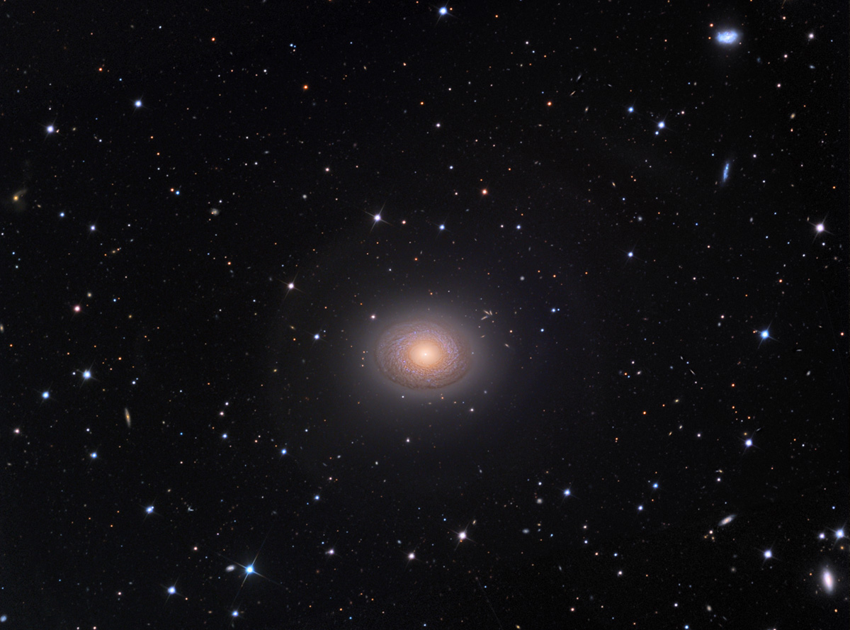 As we move away from the Milky Way in Auriga, Gemini, and Orion, we start to find more galaxies outside the Galactic plane. This spiral galaxy has tightly-wound arms, and shows almost no star formation in its nucleus. It is 67 Mly distant, and is an outlier to the Antlia-Hydra galaxy cluster, which in turn is an outlier to the Virgo supercluster.