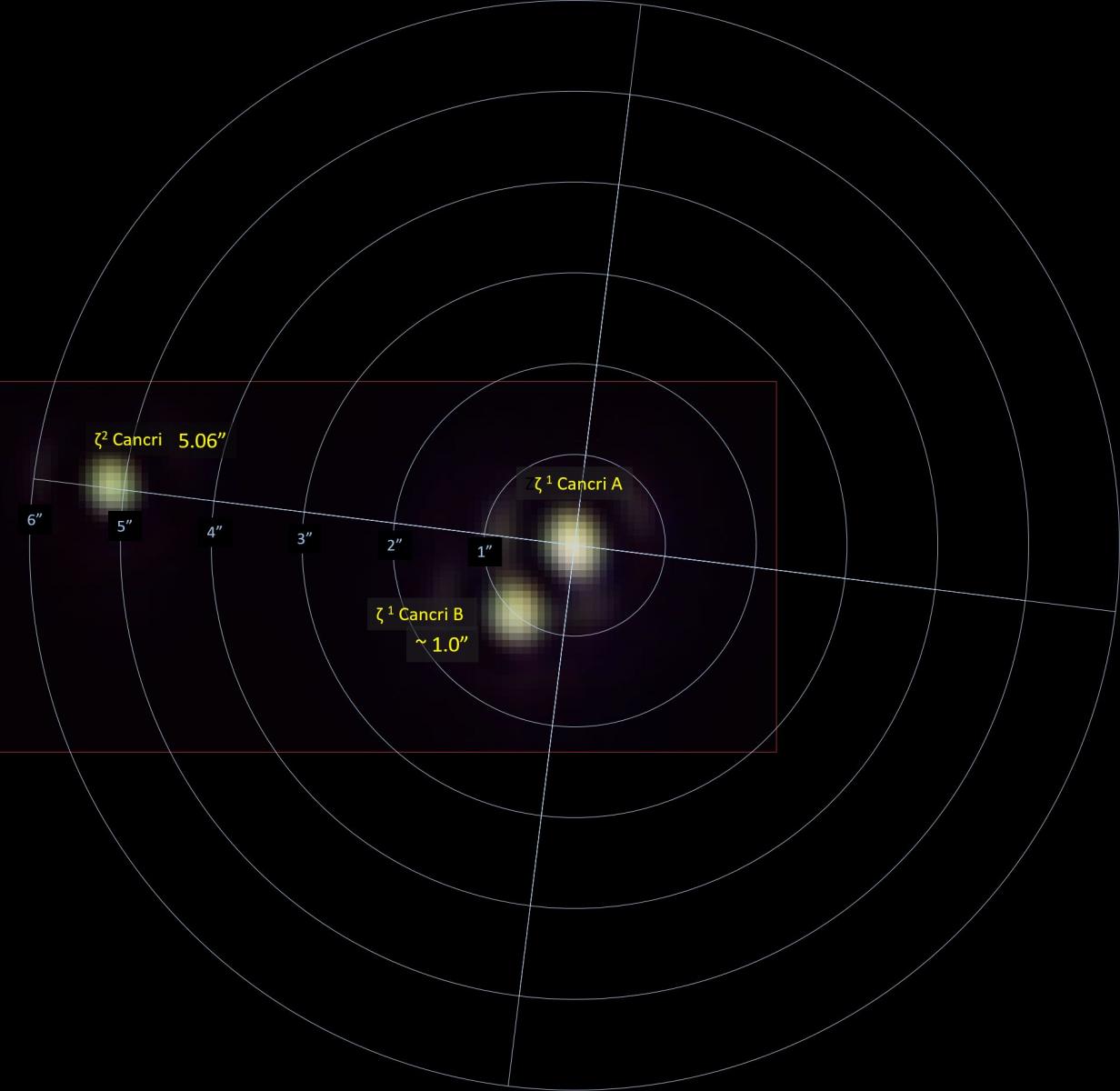 There are a few interesting double/triple stars: Zeta (ζ) Cancri - named Tegrmine - is a multiple star system: two stars are 5” apart and relatively easy to discern with a small telescope, but the primary star is also a close double star - only 1” apart, and a good challenge to discern under very good seeing conditions.