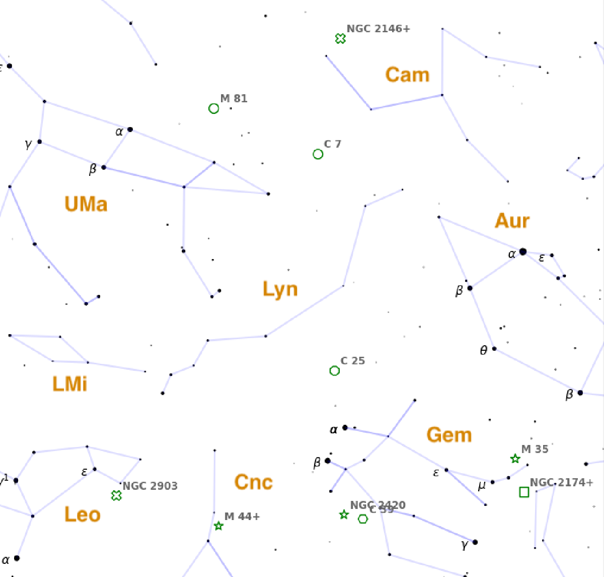 Looking to the East we move away from the winter objects in Orion, Taurus, and Canis Major (although theyβre all still observable), and into Gemini and Cancer, but also Camelopardalis and Lynx - both of which are full of deep-sky objects generally overlooked because of their dim parent constellations. As youβre musing about what to look at, donβt forget to check out this area of the sky.