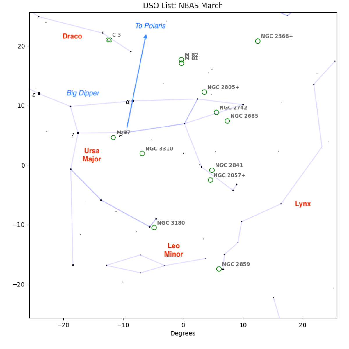With the Spring Equinox we reach the point where the Sun crosses the Equator and days are now longer than nights. As much as that means less time to observe, we can start to do so with slightly warmer weather. Orion still hangs in the western sky, with our last chance to check out those winter objects.