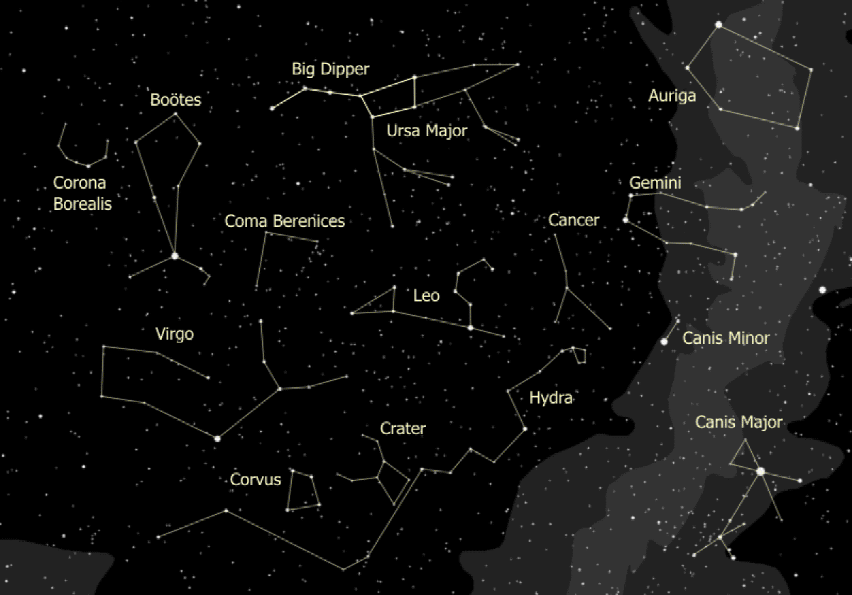 Meanwhile, other familiar locations return: Ursa Major is climbing to zenith, Leo is rising in the East, and below it, the head of Hydra - the beginning of the largest constellation that extends over a quarter of the sky.