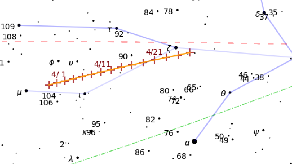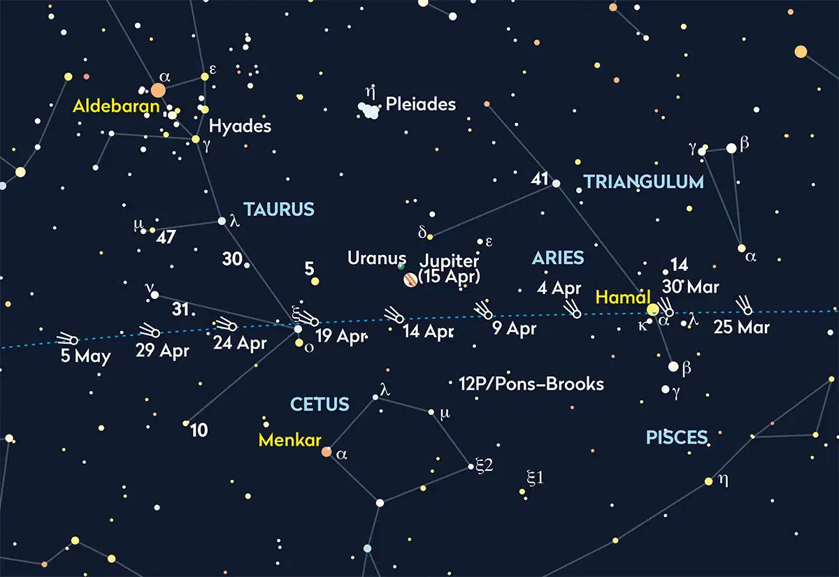 12P/Pons-Brooks starts the month in Aries, moving into Taurus, and passing Jupiter in the sky mid-month (Apr 15). It has a 71-yr period, and gets closest to the Sun on Apr. 21. While itβs possible that itβll be bright enough to see with the naked eye (as itβs prone to eruptions), it should be easily findable with binoculars.