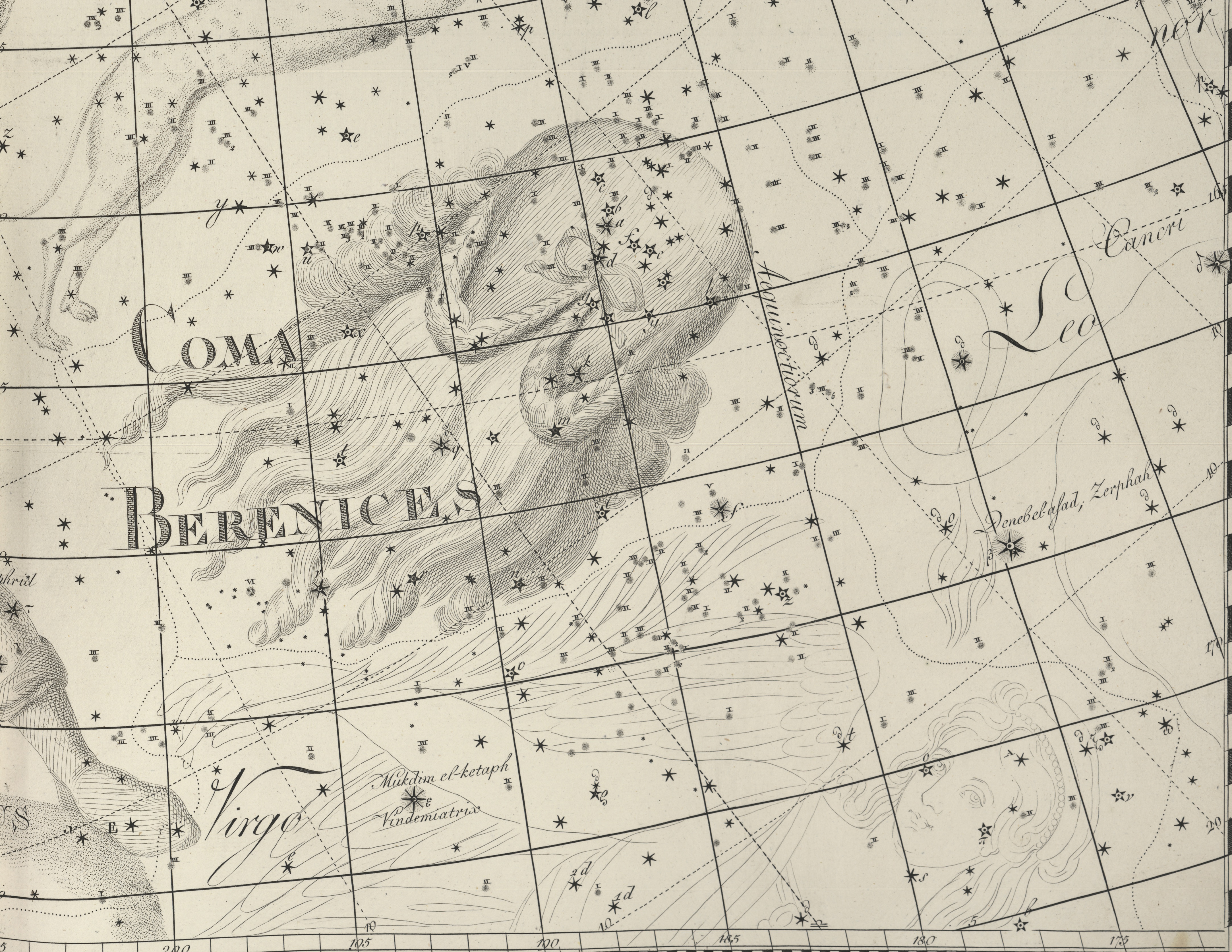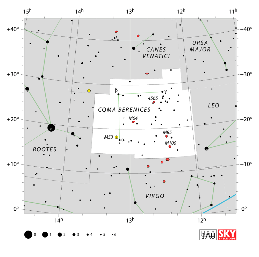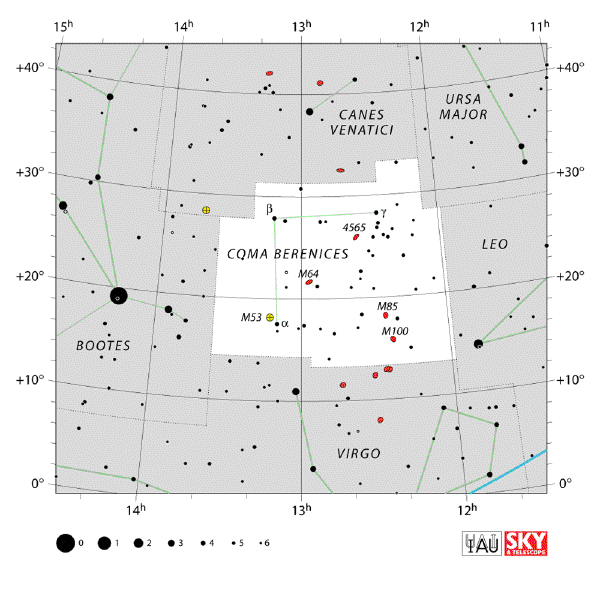 The only constellation related to a historical person, this dim collection of stars between Leo and Boötes dates from Ptolemaic times. Berenices II was queen regent of Cyrenaica (E. Libya) and later co-regent of Ptolemaic Egypt in the mid-3rd century BCE.