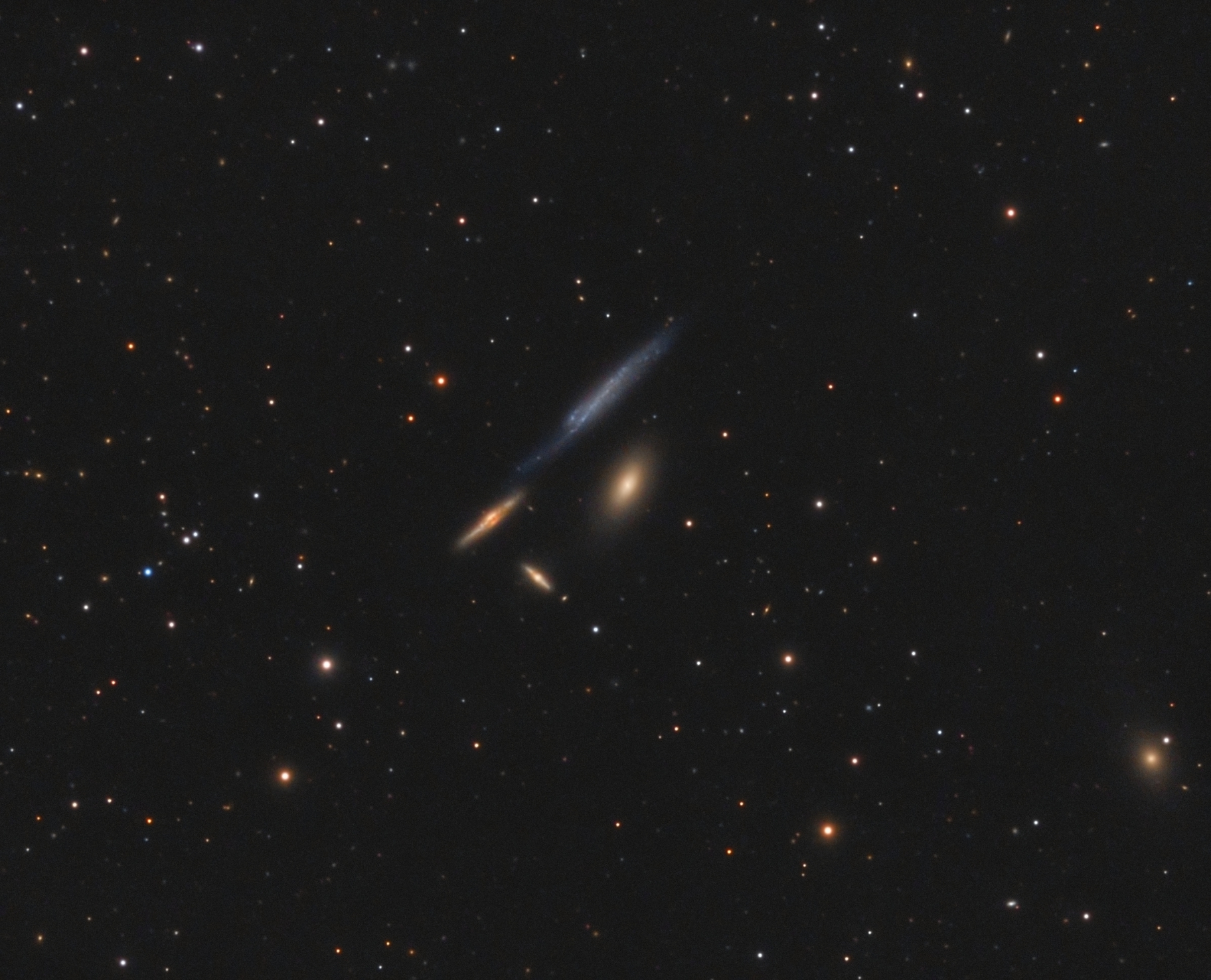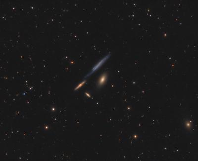 Four very different galaxies, all within a few arcminutes of each other. They’re faint (mag 12-13), especially the strewn-out NGC 4173, which unlike the others (at 190 Mly) appears to be much closer (46 Mly).
