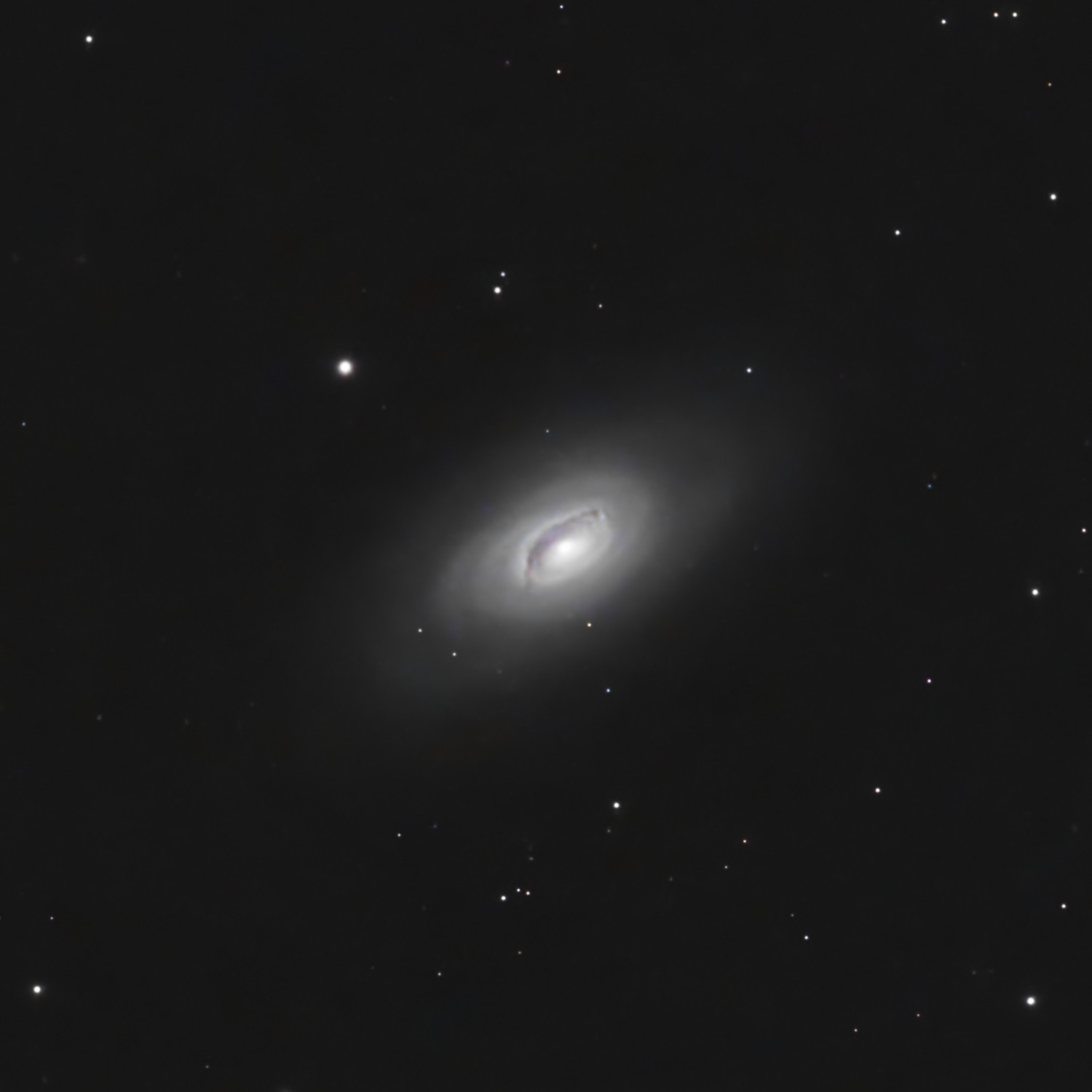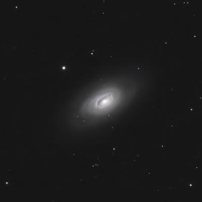 Messier 64, though in the same part of the sky as the Virgo Cluster galaxies, is actually closer - only 17 Mly distant. Its most-notable feature is the dark dust band, noticeable in even smaller telescopes.