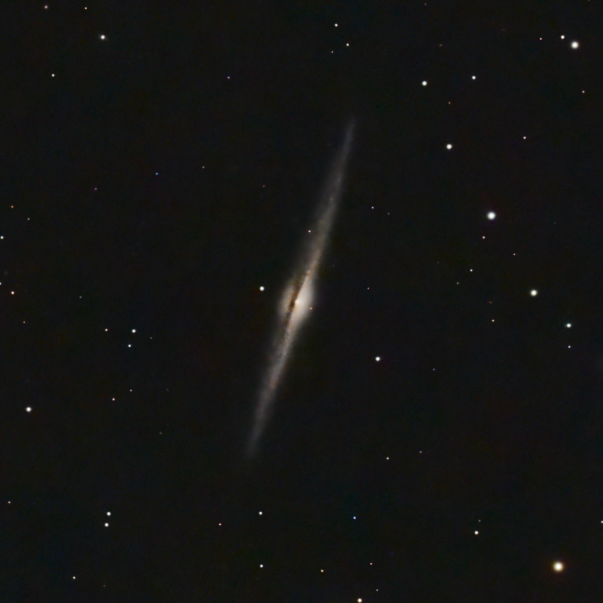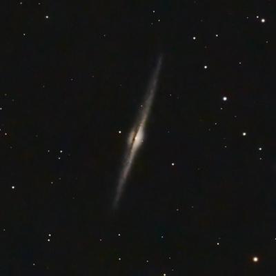 40 Million light-years (Mly) distant, NGC 4565 is a favorite object in all telescopes. It’s probably very close to what the Milky Way would look like viewed “on edge” from the outside, with a halo and dust lanes bisecting a slightly-warped disk.