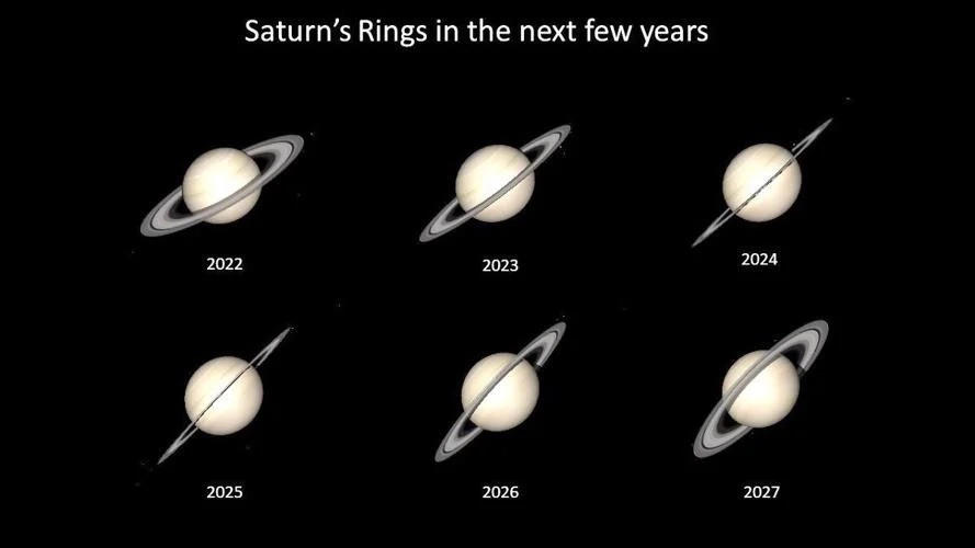 The reason for this is because - like the Earth - Saturnβs poles are inclined to its orbit, which gives us the seasons here (and there though they take on different characteristics), but the primary effect of this is that the projection of the rings to our line of sight also varies over its 29.4 year orbit around the Sun: the rings βopen upβ, then slowly close until their edge-on as seen from Earth happening about every 15 years. This will happen early in 2025, but at present, theyβre only tilted 4Β° (as opposed to 27Β° when theyβre fully open).