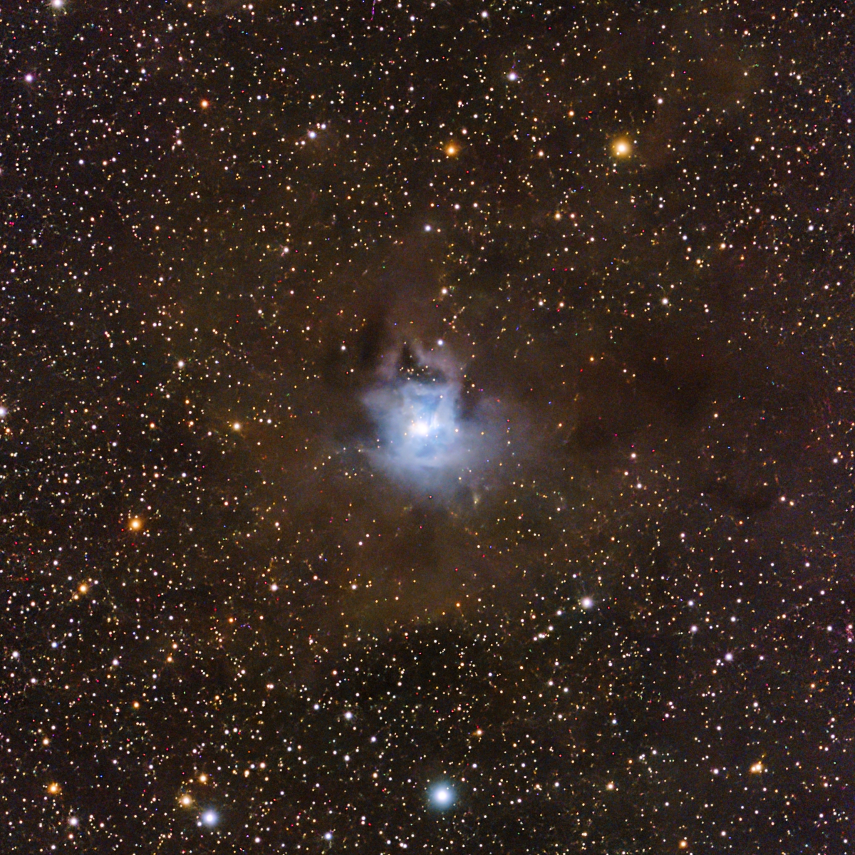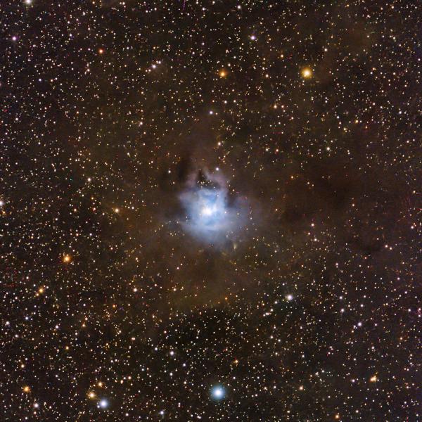 The Iris Nebula (C 4, NGC 7023) in Cepheus is a bright reflection nebula about 3 light years across, with incredible structure and dramatic variation in illumination, with dusty clouds surrounding a hot very young star.