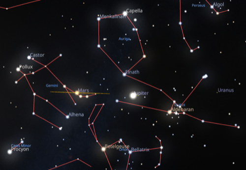 Saturn and Neptune are now early evening objects. the night, Uranus, Jupiter, and Mars finally make an appearance. All three are in Taurus. The orange lines show the path of each over the course of the month. Uranus is somewhat easy to find in binoculars, just west and slightly south of the two 6th magnitude stars 13 and 14 Tauri.