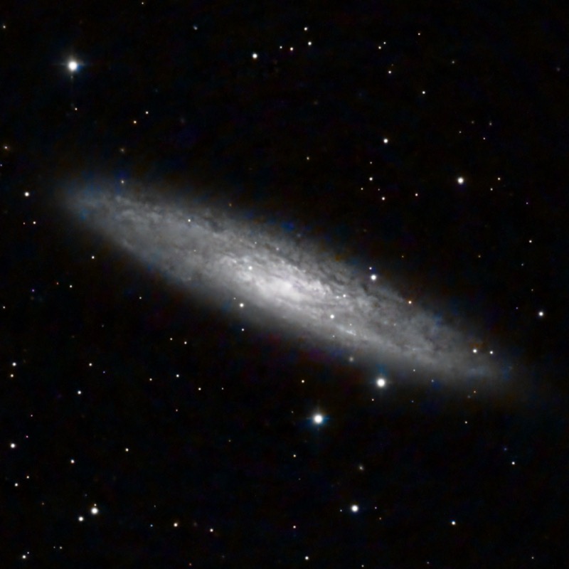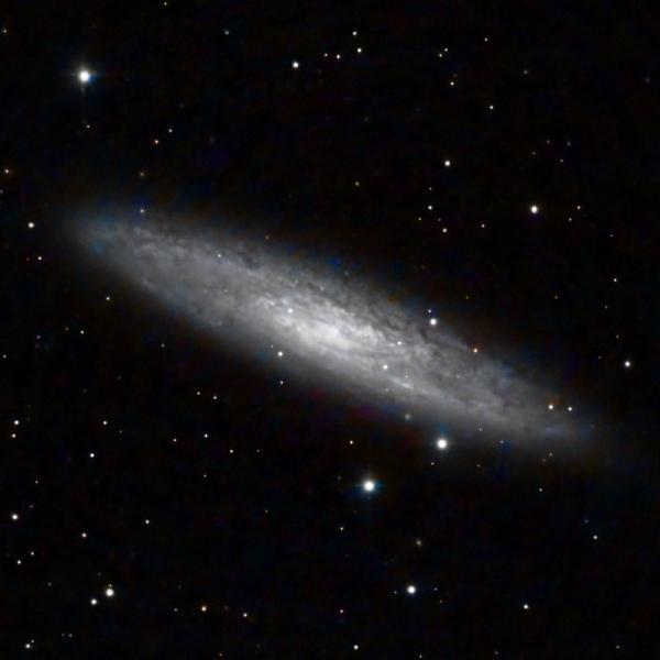 12 Mly away and the central galaxy in the βSculptor Groupβ is has a brighter inner region and disk mottled appearance with dust patches: it is experiencing significant star formation.