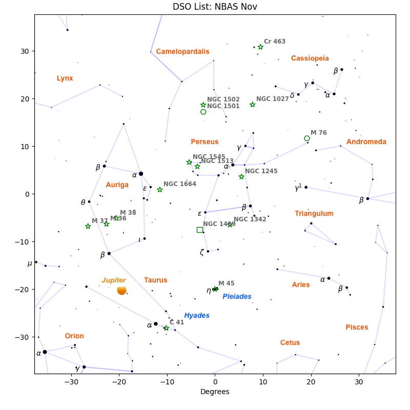 Several large, bright clusters: 4-H (NGC 1664), Jolly Roger (NGC 1501), Patrick Starfish (NGC 1245), Little Scorpion (NGC 1342), and Running Man (NGC 1545). Collinder 463 (the Queenβs Reflection) is large and pretty. Others donβt have names: NGC 1027 and 1513.