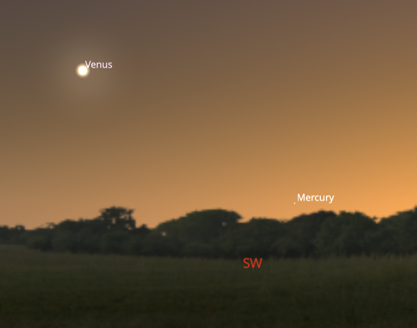 In the last week of November, if youβre lucky, you might catch both inner planets, Venus and Mercury low in the SW just after sunset. This image is for 11/17 at 5PM. While both planets are brighter than 0th magnitude, and Venus should be easy to spot, Mercury will only be 5Β° above the horizon but with some careful scanning along the horizon (prob. with binoculars) you might be able to spy it! With a telescope, both show a gibbous phase: Venus will be ~70% illuminated, Mercury 60% illuminated.