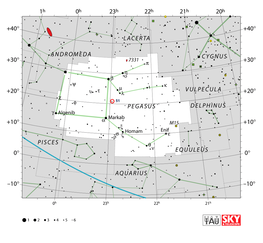 It’s easy to locate because of the “Great Square of Pegasus” asterism, made up of the four brightest stars: α (Markab), β (Scheat), γ (Algenib), and δ (Sirrah - (although this has been re-assigned to Andromeda as “Alpheratz”). The star ε (Enif - and is the brightest star in Pegasus) marks the “nose” of the horse, and is conveniently located near the globular cluster Messier 15. One observing “test” is to count stars within the Great Square: with some light pollution only a few stars can be seen, up to 10–12 in darker skies, and theoretically (under the darkest skies) 35 are possible