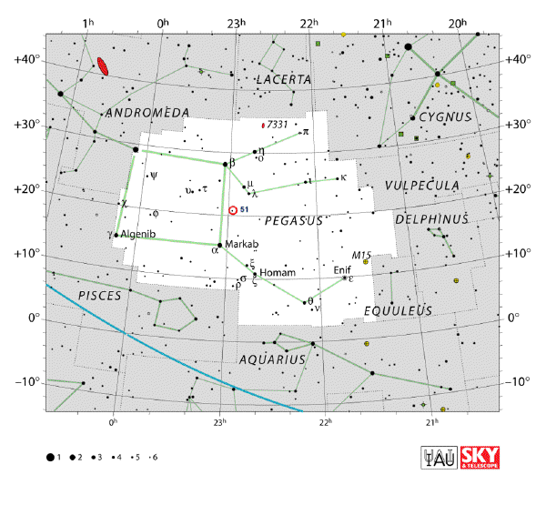 Visually 51 Peg is just a 5th magnitude star 51 light years away, but easy to locate in binoculars.