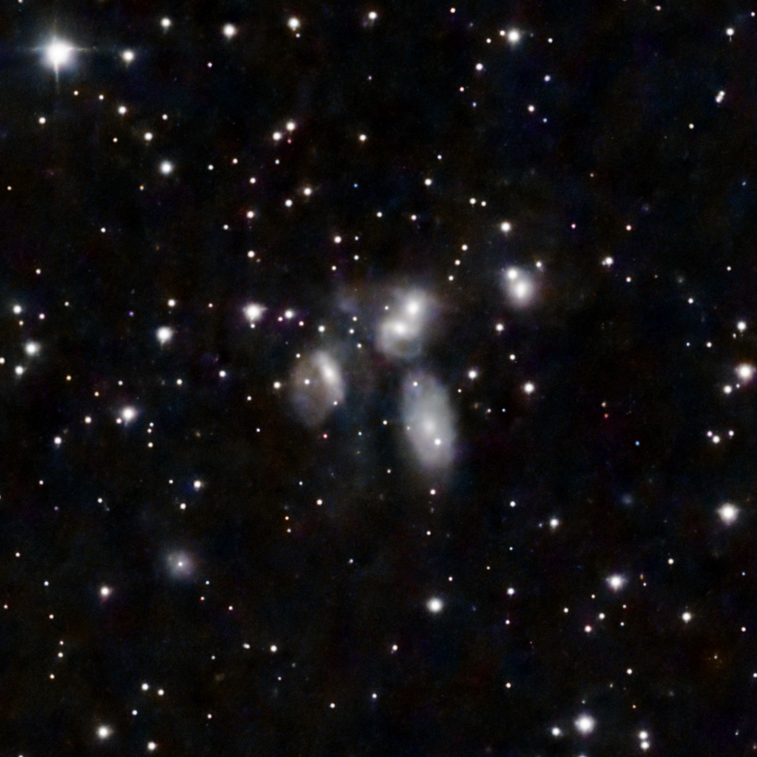 One of the most famous compact galaxy groups, like the Deer Lick group, the brightest galaxy (NGC 7320, bottom) is in the foreground (~39 Mly) but the other four (210-340 Mly) are interacting, and will eventually merge together: deep imaging shows several faint “tidal tails” connecting the galaxies. A sixth galaxy - NGC 7320C (bottom left corner) is possibly associated with the distant group as well.