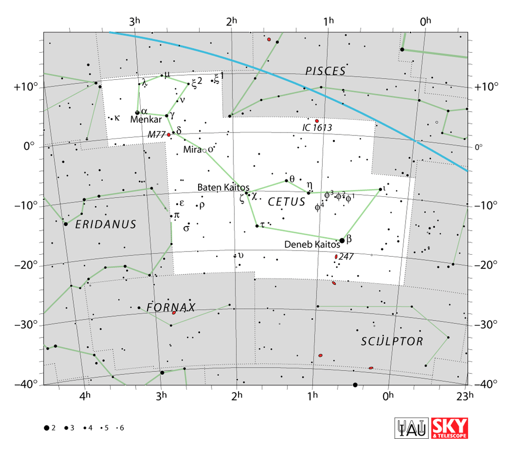 The “stick figure” of Cetus typically shows a “head” to the NE with its “body” to the South. Most of the stars are faint, although Menkar (α Ceti, marking the nose of the beast) and Diphda (β Ceti, its tail) - both magnitude 2 - stand out against the otherwise empty sky. In between, in the whale’s “neck”, is the very red star Mira which is a long-period variable. When at its brightest (every 11 months) its ruby color is especially striking.