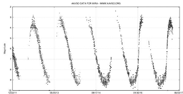 It has a period of ~334 days over which time it ranges from a minimum of mag 10 (so requiring a modest telescope to see) to as bright as magnitude 2-3 where it stands out both because of its very red color and having few bright stars nearby in the sky. The next maximum will be early April 2025, unfortunately when Cetus is close to the Sun: it’ll be a few more years when the maximum happens in the early winter skies.