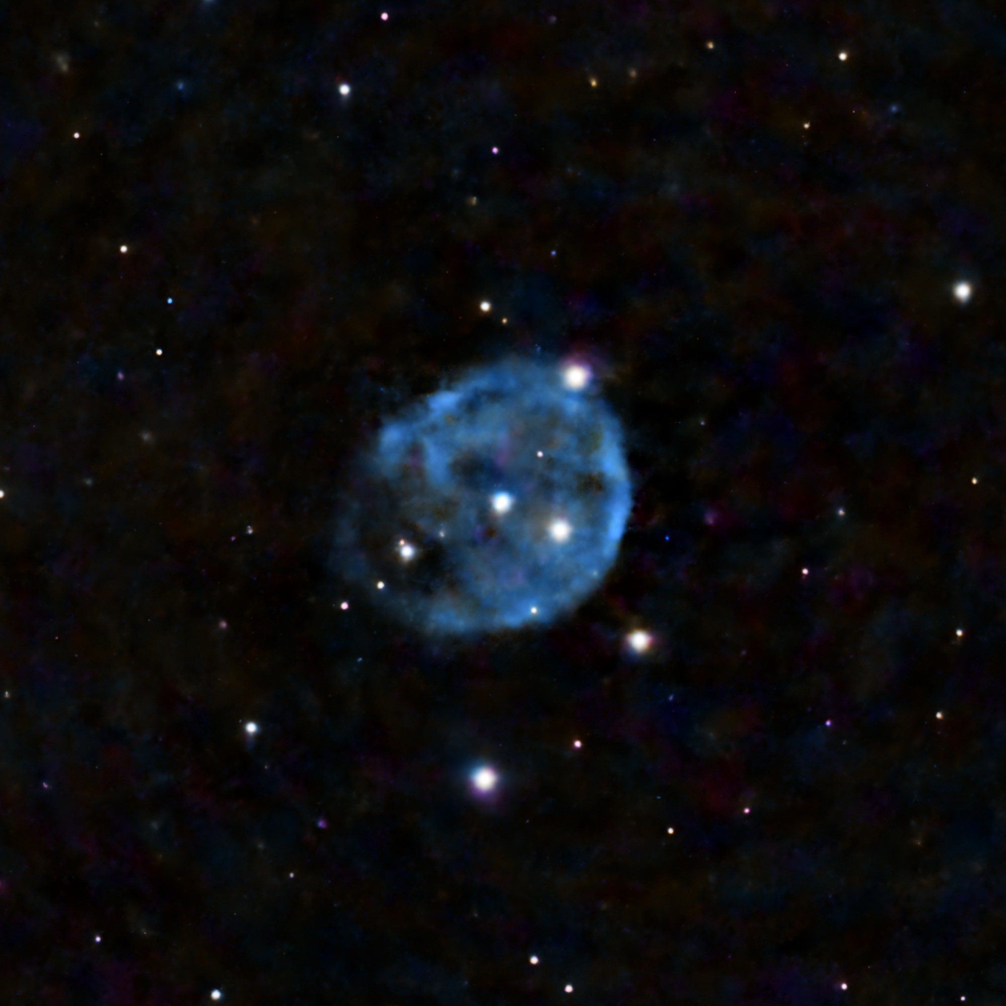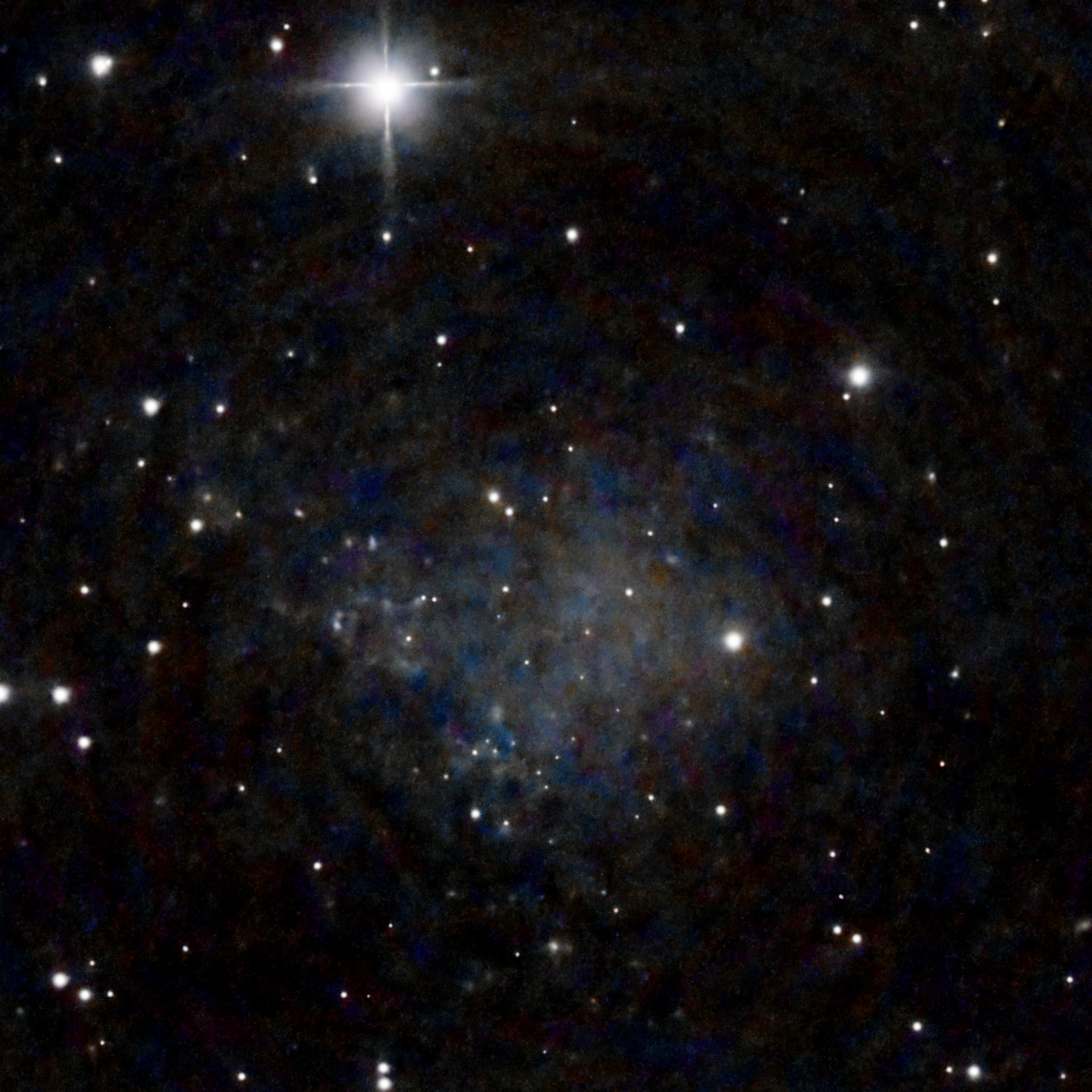 A 12th magnitude white dwarf star illuminates the planetary nebula NGC 247, itself part of a triple star system. It is about 1600 ly away, The nebula has a braided structure and is about 6-7 thousand years old (so slightly older than most PNs) and spans 2-3 light years across. Although it’s very dim (it will show up better with a narrow-band O III filter),