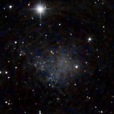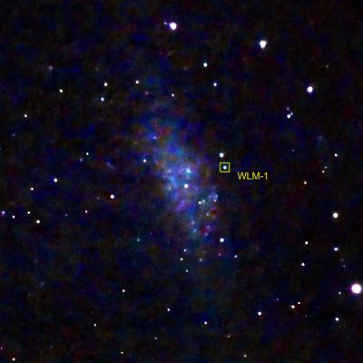 This irregular galaxy is on the fringes of the Local Group about 3 Mly away. Because of its comparative isolation, it has managed to avoid being cannibalized by other local galaxies. It is also rotating asymmetrically: one side moving faster than the other, which might mean it is passing through a denser medium. It has just one globular cluster - WLM-1 - mag 16) - identified on the image to left.