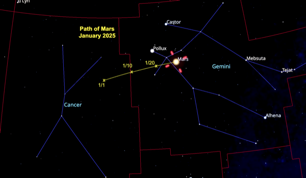Mars at opposition is exciting because itβs when weβre closest to it, that itβs (finally) large enough to spy the polar caps, and try to detect surface features. Not so in 2025: while it is only 0.64 AU away on the 14th, because of Marsβ elliptical orbit, weβre passing it when itβs almost at its farthest point from the Sun. As a result, itβs only 15β wide (slightly smaller than Saturn minus the rings) - and while shining brightly close to Castor and Pollux during January, not the best conditions for observing the planet.