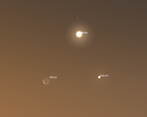 The morning of April 25th, thereβs a triple conjunction between Venus, Saturn and the crescent Moon (also Neptune and Mercury though theyβll be largely invisible in the twilight).