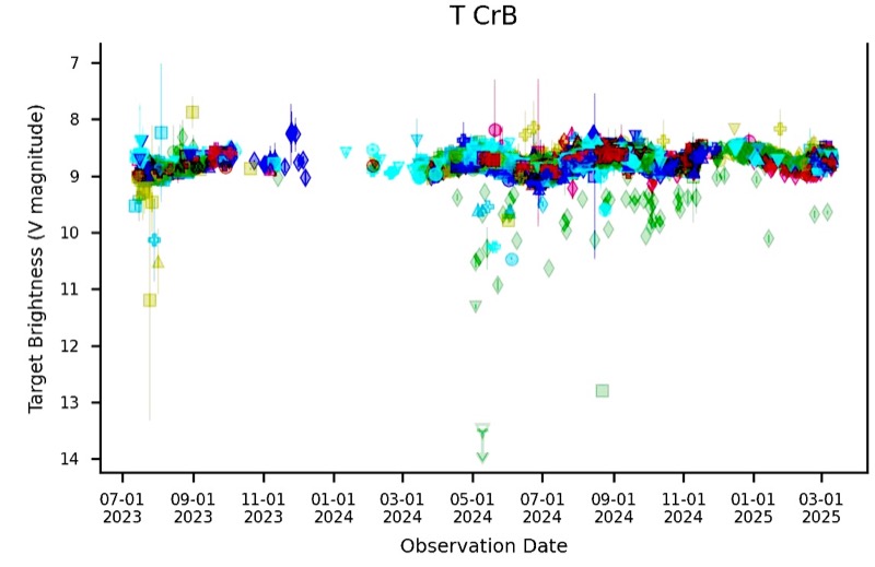 If it hasnβt already blown, there are some indications that the accretion rate to the white dwarf has increased. An interesting analysis of the previous three eruptions finds that they are spaced by close to an integral number of orbits of the binary star pair: the orbital period is ~227.6 days, and it appears that the eruptions typically happen after 125β129 orbits (so thereβs a range in the frequency between 78β81 years - weβre in year 79 now.