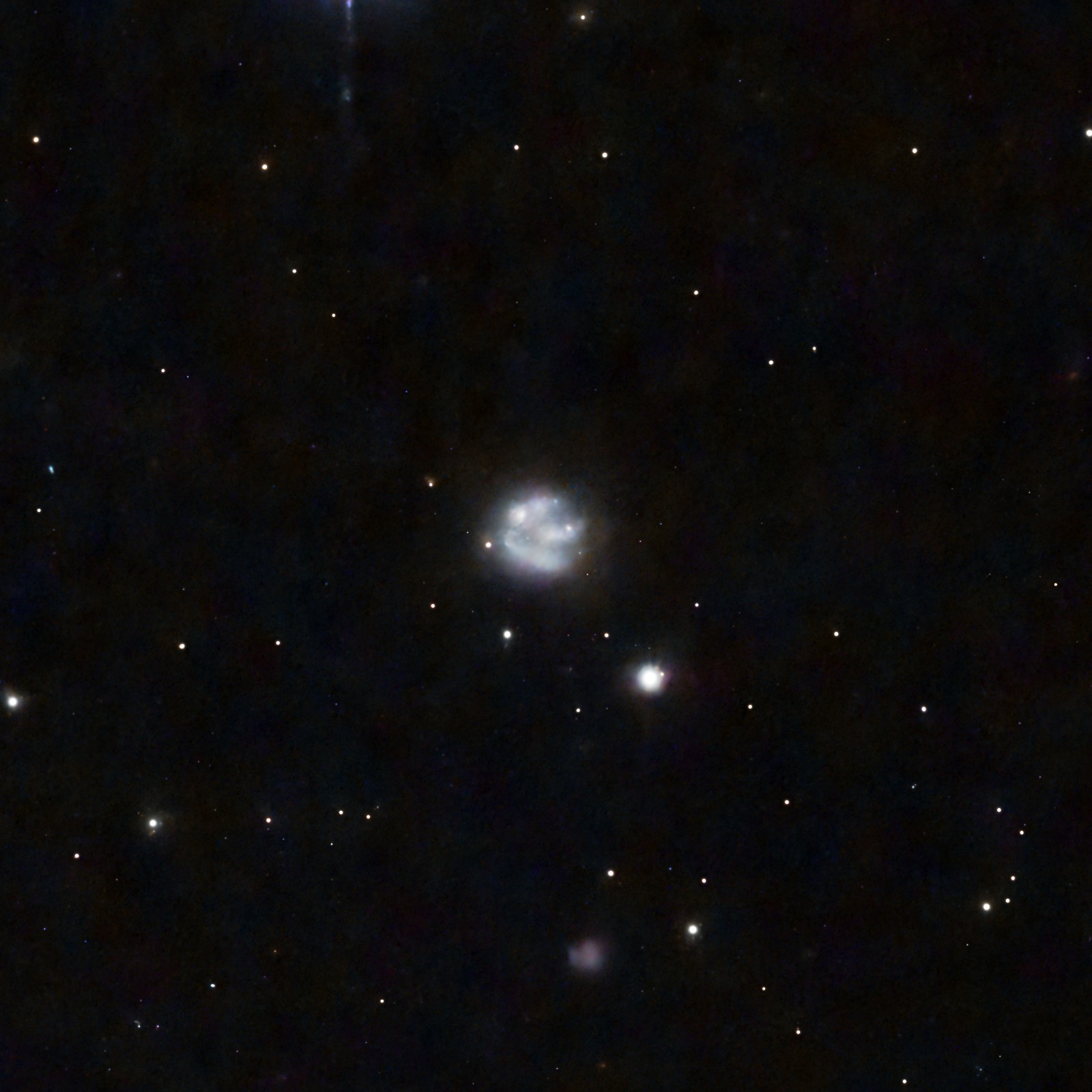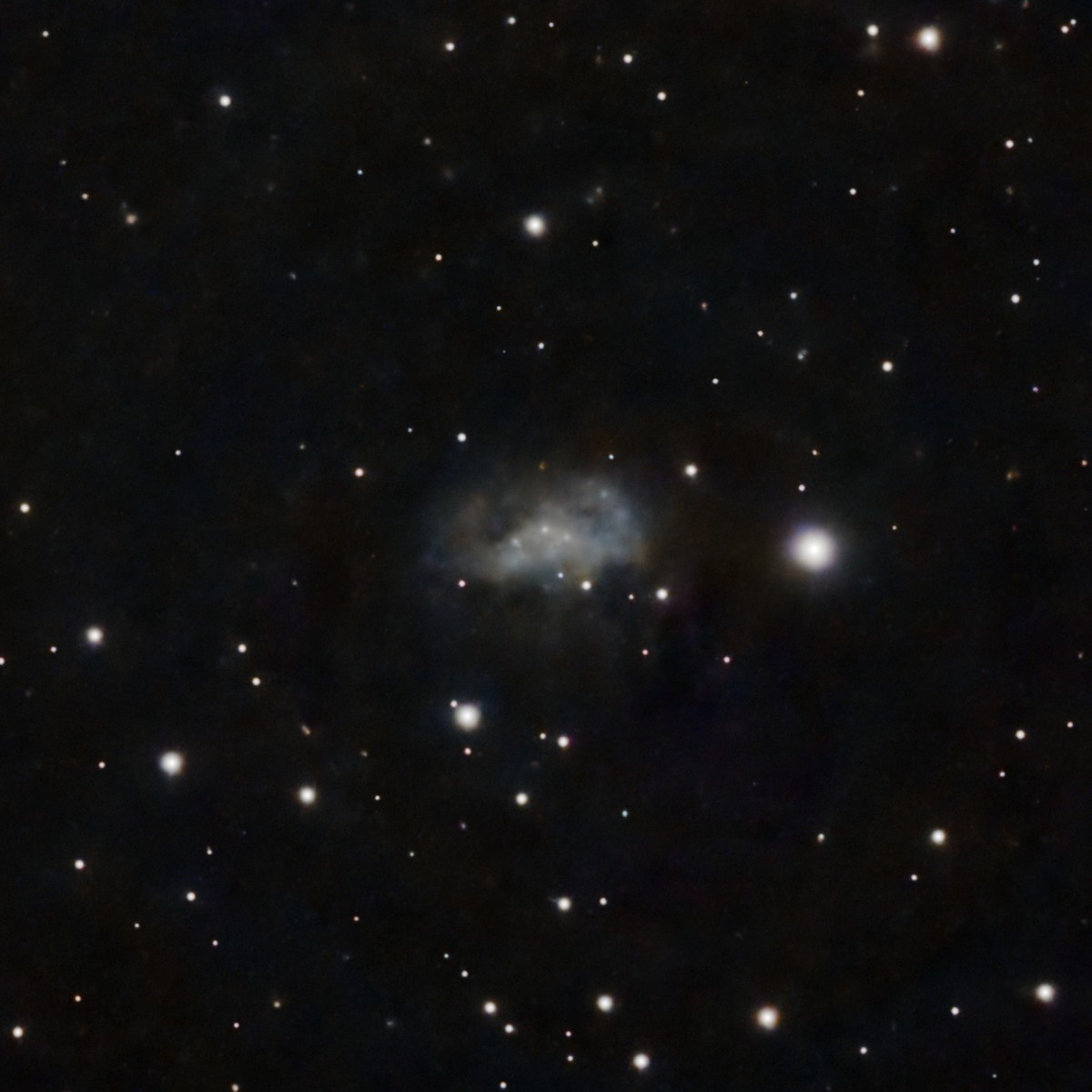 Situated close to the border with Ursa Major, this distorted galaxy is a “blue compact dwarf” galaxy - containing large clusters of young hot massive stars - leading to its color. It’s about 23 Myr away.