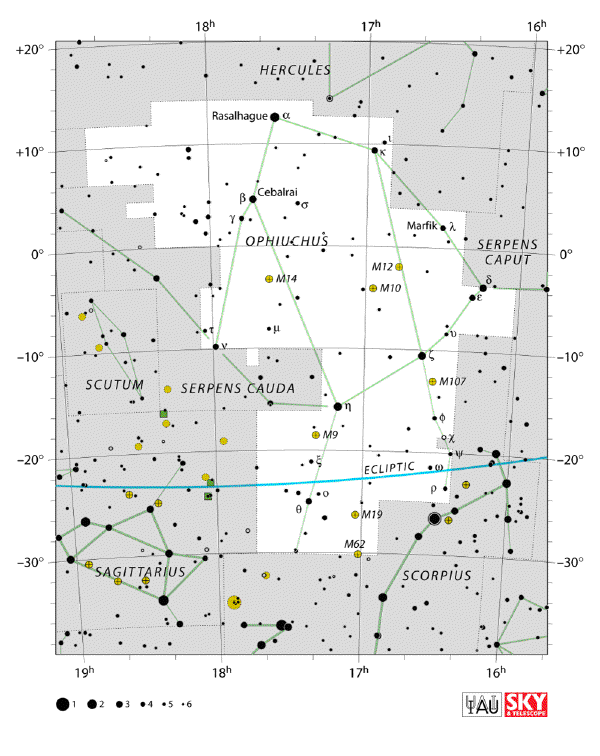 In many early star charts he is seen trampling on Scorpius with his feet, with the scorpion - in turn - trying to sting him. Kepler’s Supernova of 1604 was in southern Ophiuchus, coming only 30 years after the 1572 supernova in Cassiopeia observed by Tycho (we’re very overdue for such an event - at least within our own Galaxy), reaching magnitude –2.5, and visible in the day for ~3 weeks.