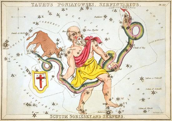 One of Ptolemy’s original 48 constellations, Ophiuchus (sometimes called Serpentarius) was described by the Greeks (specifically in Eudoxus’ poem from the 4th century BCE) but could also have older Babylonian origins, representing Nirah a serpent god, half-human with snakes for legs. In fact the name is a Latinized version of the earlier Greek Ophioūkhos (serpent-bearer).