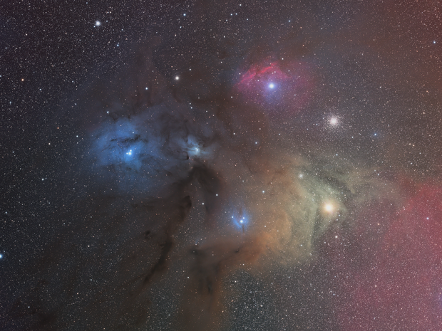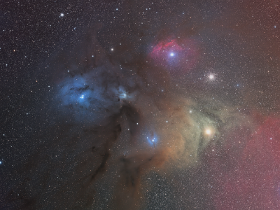 The ρ Ophiuchi complex is one of the closest star-formation region (460 ly) to the Solar System. It spans a large (4½°x6½°) swath of sky, extending (in the sky) to Antares (which is further away - 550 ly), full of young stellar objects. The range of colors is stunning: best captured with camera and tracking mount.