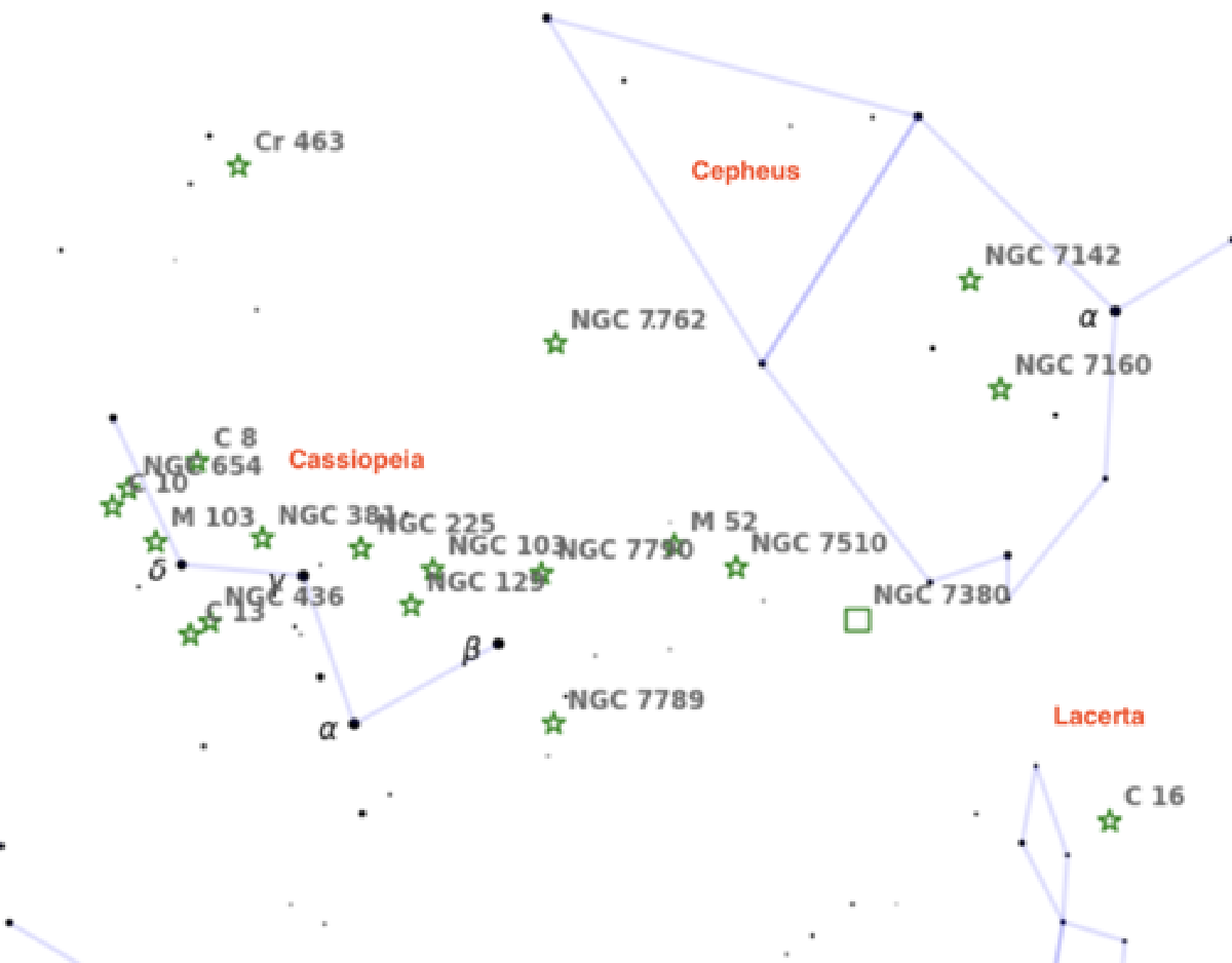 Stretching from Perseus (with the famous βDouble Clusterβ) all the way across Cassiopeia, Cepheus, and even Lacerta (with a few more in Andromeda), there are dozens of open clusters to discover! Just scanning from one end to the other (all the way to Deneb) youβre treated to one after another after another, all different sizes, shapes, concentrations, many with nice color contrasts in the brighter stars. The map above just shows a few of the more well known ones: