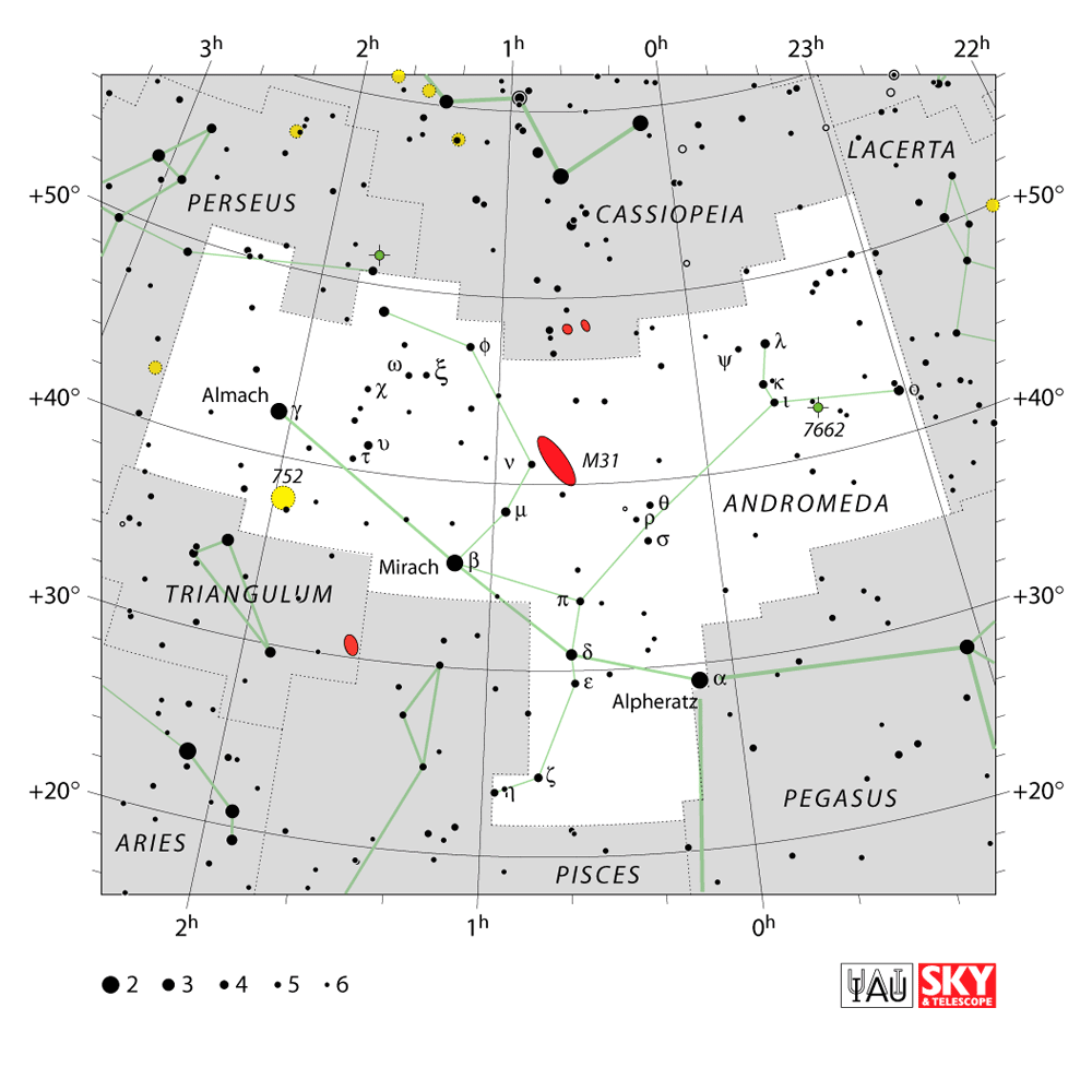 The bright star Alpheratz is part of the Great Square of Pegasus. The three brightest stars (Alpheratz, Mirach, and Almach) extend to the East from Pegasus over to Perseus. The Andromeda Galaxy (M 31) can be easily located following from red-giant Mirach through the fainter Mu (μ) Andromedae to a fuzzy patch that is the galaxy. Scanning with binoculars slightly “left” from between Mirach and Almach, you might spy the open cluster NGC 752. Similarly, going from Mirach in the opposite direction from M 31 you might see the large - but faint - Triangulum Galaxy (M33).