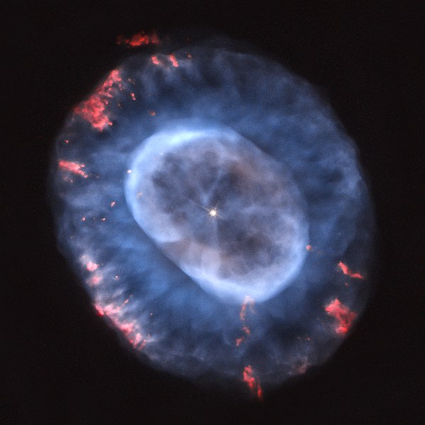 This is NGC 7662, also known as Caldwell 22, a planetary nebular almost 6,000 light years from Earth, the remnant of a star that ejected its outer layers, about 3,000 years ago. In a small telescope this will appear like a bluish ring; the color is caused by glowing atoms of oxygen that have lost two of their electrons - this happens because the gas is still heated by the hot star at the center, which itself is on the way to becoming a white dwarf star.