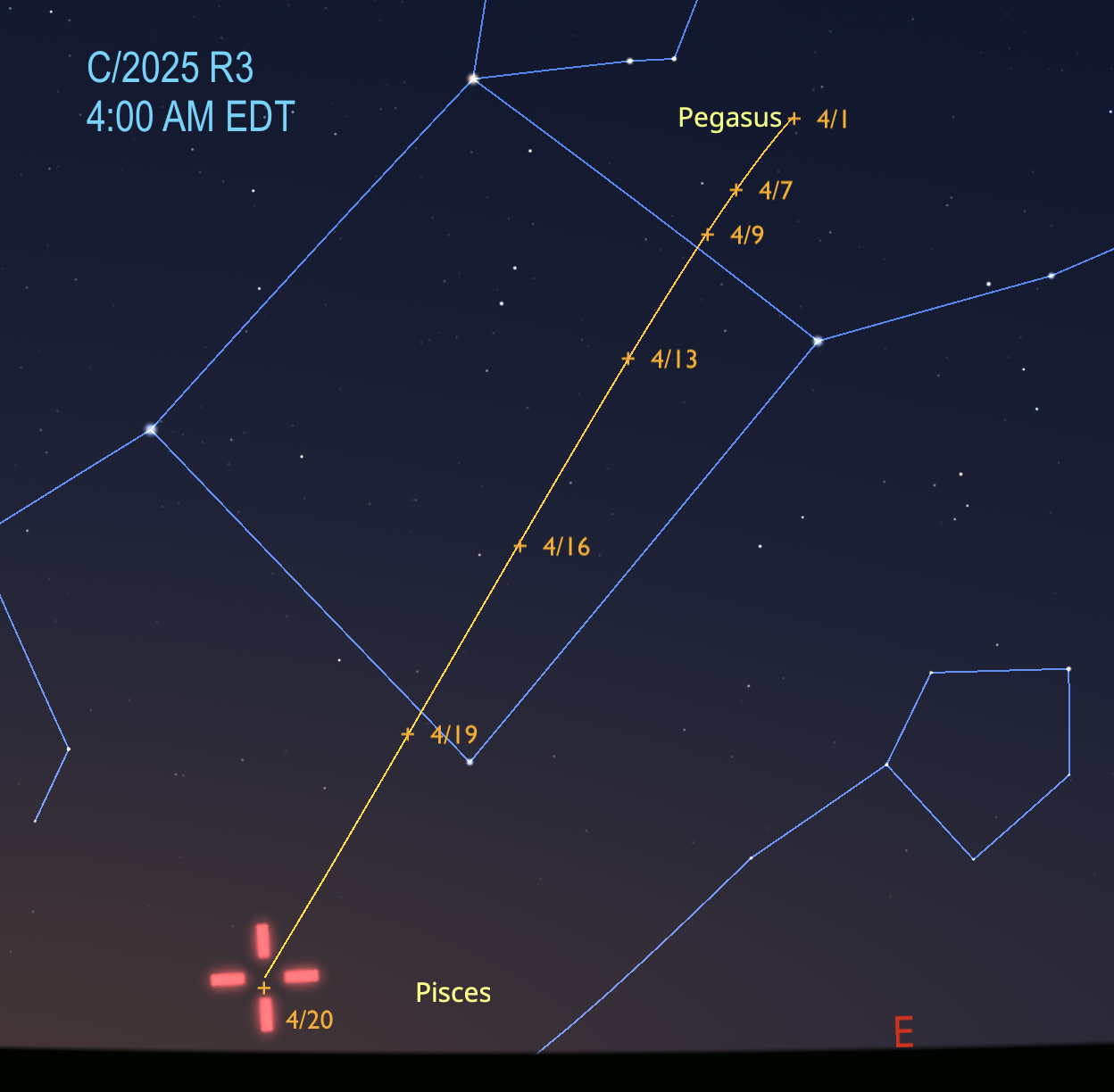 This comet starts out faint, but has the chance it might be visible in binoculars as it gets closer to perihelion on the 19th. It’s somewhat easy to find since it spend the first half of April crossing the Great Square of Pegasus.