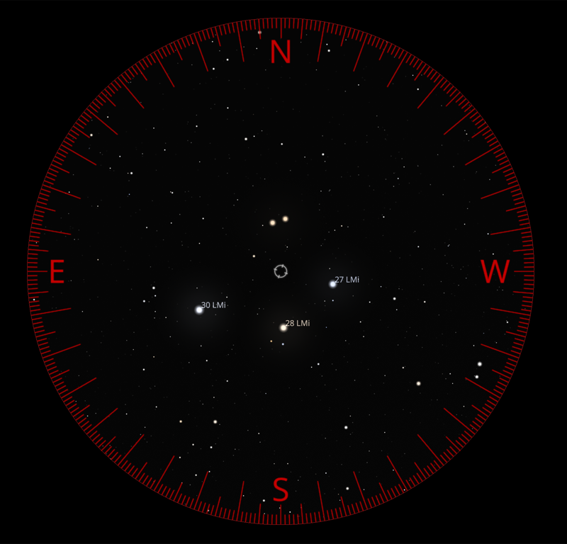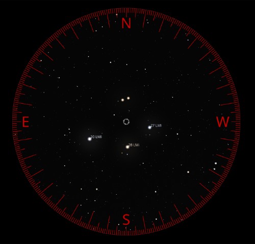 Only one bright-“ish” star in Leo Minor (at this time) has a proper name: 46 Leonis Minoris was bestowed the name Praecipua by the IAU (who has recently taken on the task of making “official” lists of star names, for some reason) — which is also the brightest star in the constellation. For whatever reason, Bayer did not give it the designation Alpha. On the map above, it’s the star on the Eastern corner of the diamond (on most star maps, as here, North is “up” and East to the “left”, almost touching the border of Ursa Major.