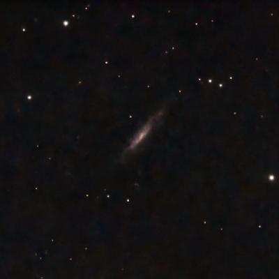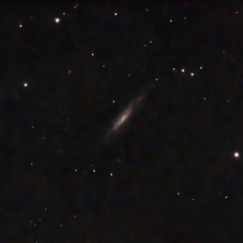 Another barred-galaxy (though the bar is hard to see), NGC 3003 is nearly edge-on whose star-formation regions are definitely asymmetric (most are on the W side, though there’s a region on the opposite side in a faint spiral arm that looks “detached” from the rest of the galaxy. It’s just under 64 Mly away.