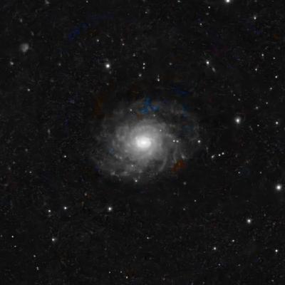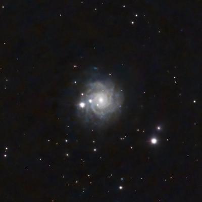 This nearly face-on barred-spiral galaxy is classified as a Seyfert galaxy, i.e., one with a nucleus whose brightness dominates the galaxy as a whole. It probably hosts a supermassive black hole at its center, though one that only that’s only 1 million times the Sun’s mass (ours is 4.15 million solar masses). It has several thin, loosely wound spiral arms that are “knotty” with star-forming regions.
