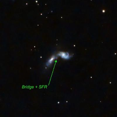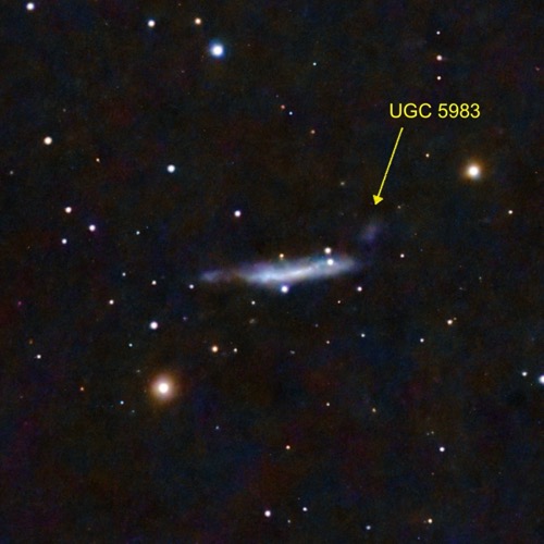 This interacting galaxy is 37 Myr away (with UGC 5983 off the right side) and in a “pre-starburst” phase, with is substantial star formation already underway (though still at a lower rate than the Milky Way). Very faint tidal streams connect it to the companion. A “false supernova - SN 2000ch - was recorded, but subsequent outbursts showed it was actually a Luminous Blue Variable (similar to S Doradus and Eta (η) Carinae): a very rare type of star (there are only a handful known in our own Galaxy, and S Dor itself is actually in the LMC). These stars show extremely energetic outbursts, losing significant mass and will eventually have that final explosion as a supernova.