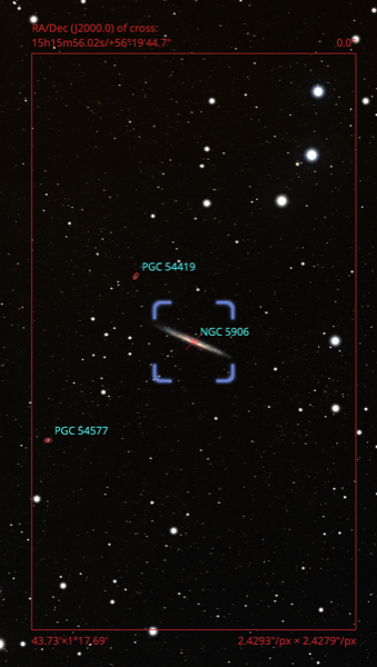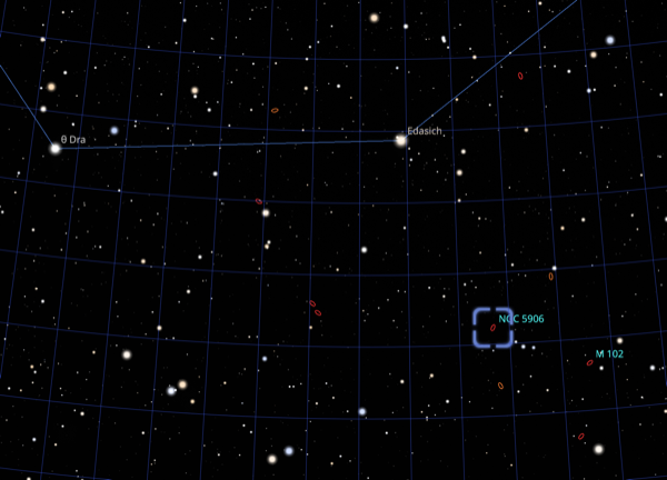 NGC 5907 is an edge-on galaxy only 1.5° ENE of Messier 102. It’s fairly large and bright,