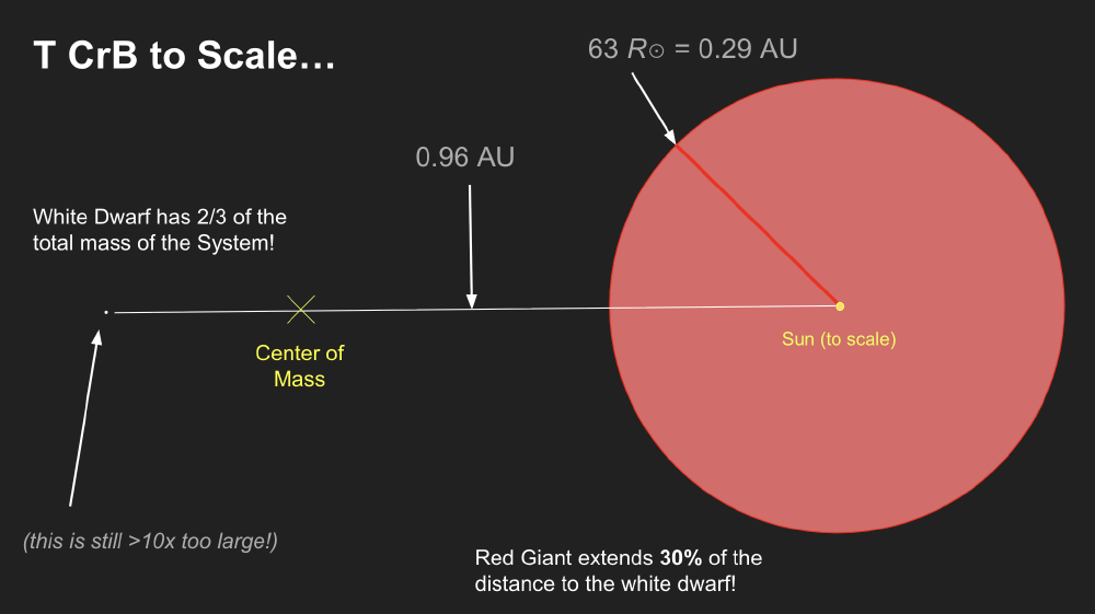 T CrB is a binary system with a red giant star and a white dwarf, in a nearly-circular orbit. The separation is about the same as the Earth and the Sun (0.96 AU), and they’re locked in a 227.58-day orbit.